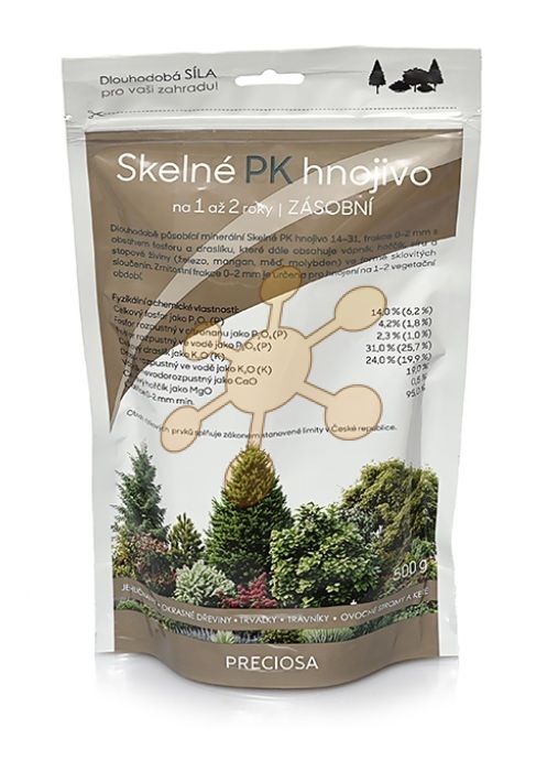 Dlouhodobě působící minerální Skelné hnojivo PK obsahuje fosfor, draslík, vápník a hořčík, které jsou důležité pro růst a vitalitu rostlin. Tyto esenciální prvky se uvolňují do půdy po dobu 1-3 let v množství, které je pro výživu rostlin dostačující. Proto není potřeba tyto složky dále doplňovat. Rozpouštění hnojiva je podmíněno vlhkostí a teplotou nad 8 °C, (tj. běžné půdní podmínky v období březen - listopad).