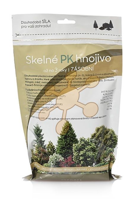 Dlouhodobě působící minerální Skelné hnojivo PK obsahuje fosfor, draslík, vápník a hořčík, které jsou důležité pro růst a vitalitu rostlin. Tyto esenciální prvky se uvolňují do půdy po dobu 1-3 let v množství, které je pro výživu rostlin dostačující. Proto není potřeba tyto složky dále doplňovat. Rozpouštění hnojiva je podmíněno vlhkostí a teplotou nad 8 °C, (tj. běžné půdní podmínky v období březen - listopad).